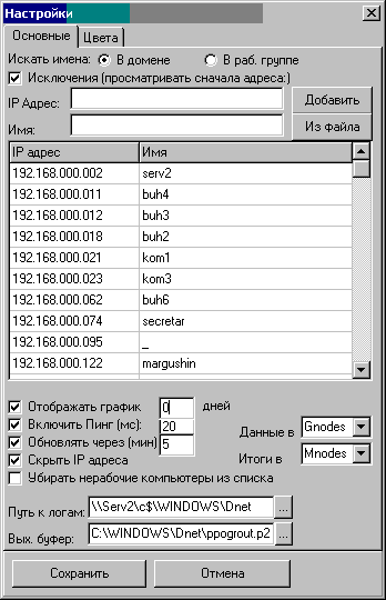 программа попытается определить имя сама. 2. Кнопка Добавить добавляет имя и соответствующий IP адрес в список имен. 3. С помощью кнопки Из файла модно загрузить список имен компьютеров подготовленный программой superscan. 4. Если поставить галочку Включить Пинг то программа будет подсвечивать выключенные компьютеры отдельным цветом. 5. Отображать график - отображать график итогов за Х дней или за все дни если стоит 0. 6. Обновлять через - обновлять информацию каждые Х минут 7. Скрыть IP адреса - скрывать IP адреса из списка. 8. Убирать неработающие компьютеры из списка - Понятно само по себе. 9. Путь к логам - путь к файлам логов прокси-сервера pproxyogrp2*.log. 10. Вых. буфер - путь к файлу ppogrout.p2. |